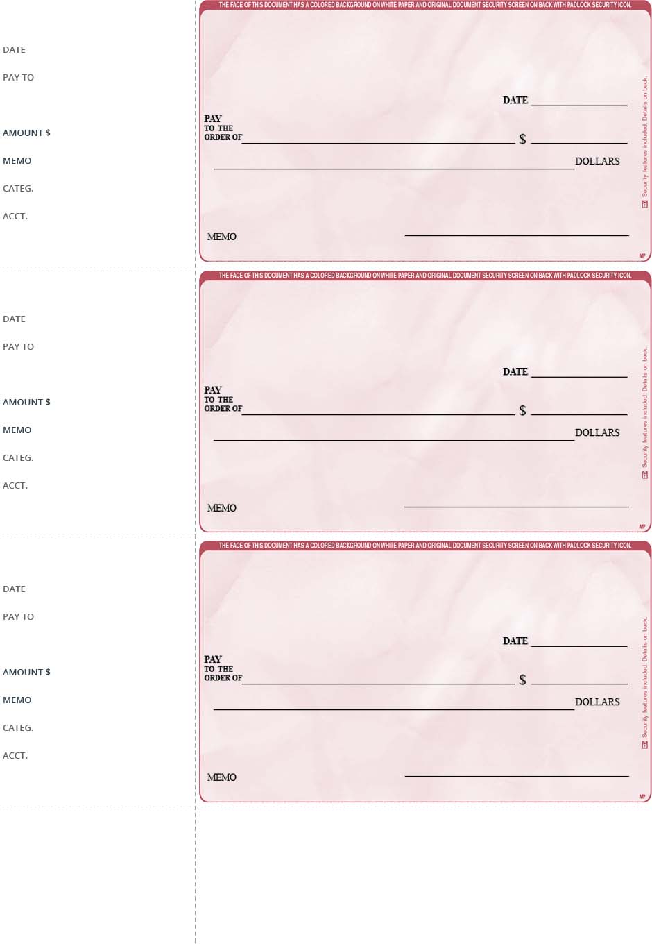 Each pre-printed page includes 3 wallet-sized checks with adjacent check stubs. Checks are printed on standard 8.5” x 11” pieces of paper. Use the convenient check stubs to keep accurate records. All elements on the page are separated by micro-perforations to facilitate separation.
